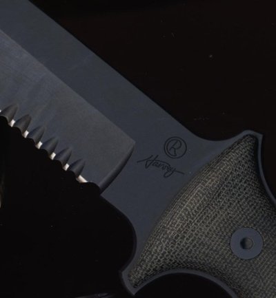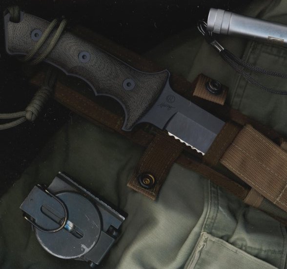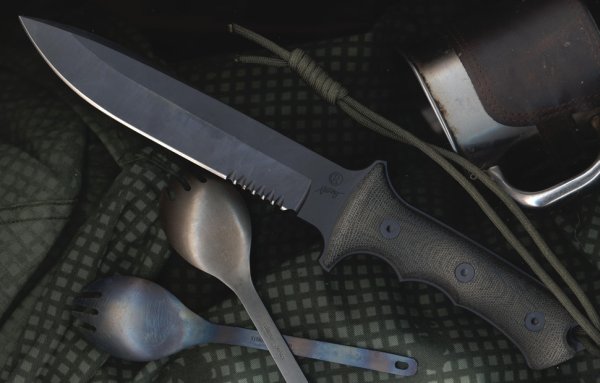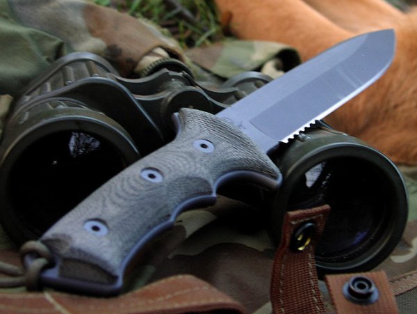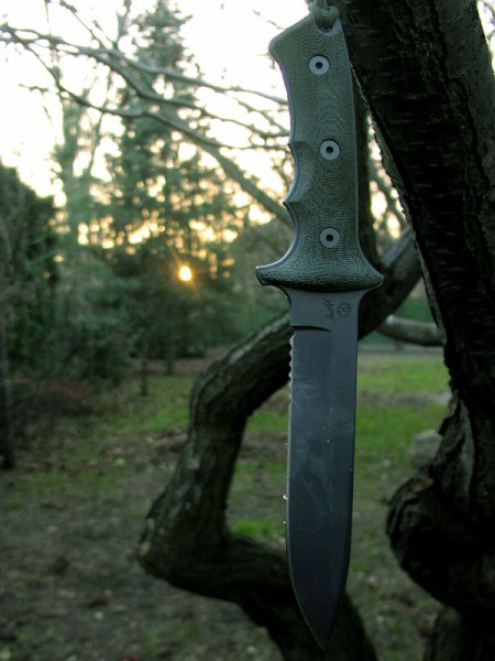 Drugą rzeczą, na jaką od razu zwróciłem uwagę to rękojeść. Szaro-bura Micarta o dużej i bardzo wyraźnej teksturze nie tylko sprawia wrażenie pancernej. Jest pancerna. Jednocześnie wygodna i nie kaleczy łapy. Widać też, ze to nóż dla Zielonych Beretów a nie wychudzonej zbieraniny z pospolitego ruszenia. Wyprofilowanie uchwytu świadczy o tym, iż zaprojektowano go dla osobników o pięściach jak bochny chleba, co - o dziwo - zupełnie nie przeszkadza w pracy takiemu chłystkowi (w dodatku mańkutowi) jak ja. Pomaga za to przy pracy w rękawicach i wtedy każdy paluch trafia na swoje miejsce. Miałem duże obiekcje, co do obustronnego jelca. Tak się składa, że garda w nożach kojarzy mi się dość jednoznacznie z wbijaniem klingi w otrzewną czy osierdzi. Trzeba jednak powiedzieć, że w przypadku GB7 do prac kuchennych z dolnym jelcem można się bardzo szybko przyzwyczaić, a górny znakomicie służy jako podpórka na kciuk przy cięciach drobniejszych i wymagających większej precyzji. W końcu to - do cholery - nóż wojskowy ogólnego zastosowania a nie kuchenniak obozowy. I właśnie ta wszechstronność Green Bereta zrobiła na mnie największe wrażenie. |