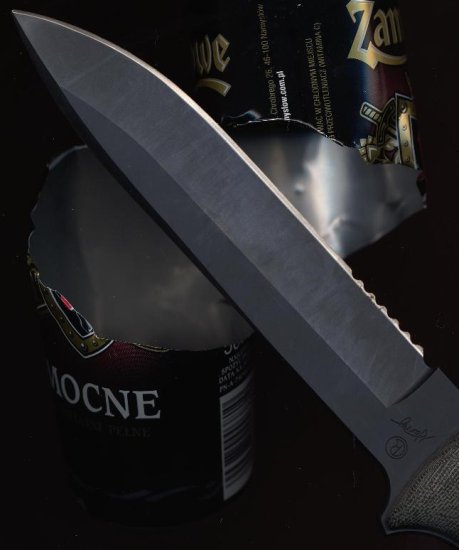 „Żeby nie było niedomówień”, napisał mi Piter, „to jest nóż do używania i nie musisz się bać, że go porysujesz czy stępisz. Idzie do mojej kolekcji, a nie na sprzedaż - nie rąb nim cegieł, ale też go specjalnie nie oszczędzaj”. Prawda, że fajnie napisał? :))) Już pierwszego dnia przystąpiłem do testów kuchennych, bo poza szeroko pojętym włóczęgostwem i traperstwem (zwanym też przez grupę V.S.O.P. surwiwalem), lubię czasem coś dobrego do jedzenia ugotować mojej babie. Umówmy się - GB7 to nie Santoku ani nóż szefa. Nigdy nie będzie rasowym kuchenniakiem. Ale to, co potrafi zrobić w kuchni wykracza daleko poza możliwości standardowego noża wojskowego. Pomimo grubego ostrza - tnie jak wściekły i przy odrobinie wprawy ostrze nie schodzi z linii cięcia. Szatkuje cebulę i czosnek. Rąbie zmrożone mięso. Plasterkuje kiełbadrona na przezroczyste plasterki. Nawet tradycyjny test na cięcie pomidora potrafi przejść bez wstydu. Niczego więcej nie oczekiwałbym od noża w teren. Powiem więcej - zaskoczył mnie skubaniec. Gdy Anka wróciła do domu, od razu wzięła Green Bereta w łapki. „Śliczny” - powiedziała – „Twój?”. „Nie, ale możemy nim ponapieprzać w ramach testów. Uważaj, ostry.” - odmruknąłem. Ponieważ przeprowadzamy się do nowego mieszkania i wszystko w naszym domu wygląda jak przejściu Armii Czerwonej i epidemii tyfusu, Anka postanowiła sprawdzić ostrość GB7 na drewnianym blacie kuchennym, grubym (tak na oko) na jakieś pięć centymetrów (lite drewno). Zanim zdążyłem coś powiedzieć, przypieprzyła z całej siły w blat. Nóż wbił się jak w masło a blat nie był już taki śliczny i na jego krawędzi widniała potężna wyrwa. Faktycznie ostry. |