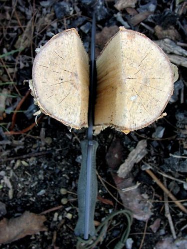 Drugi powód dla zastosowania powłoki jest bardziej prozaiczny. GB7 to nóż, którego docelowym użytkownikiem jest jednak wojsko. Szara powłoka nie odbija światła i świetnie maskuje się na dowolnym tle, co widać na zdjęciach. Wyobrażam sobie, że niewielu z użytkowników będzie się podkradać pod pozycje nieprzyjaciela z klingą w zębach by wykorzystać nietuzinkowe właściwości swojego noża. Specyfikacje militarne wymagają jednak by sprzęt nie świecił w ciemnościach, więc nie świeci. Dla cywila to tylko taktyczny bonus dla podbudowania samopoczucia. Podejrzewam, że dla większości wojskowych zresztą także. Gun Kote w przeciwieństwie do większości skutecznych powłok jest wyjątkowo gładka i śliska. Ułatwia to znakomicie krojenie rzeczy gąbczastych i miękkich a przy twardych materiałach zapobiega zakleszczaniu się klingi w połowie cięcia. Dzięki swojej śliskości powłoka nie ściera się tak bardzo jak to bywa w wypadku zabezpieczeń chropowatych. Mimo najszczerszych chęci i intensywnego katowania noża, nie udało mi się pozostawić na klindze najmniejszej nawet rysy „do gołego metalu”. Jedynie na progu kończącym szlif głowni pozostały lekkie przebarwienia/obtarcia po rąbaniu bali. Przetarcia te nie sięgnęły jednak powierzchni stali i pewnie ciężko by było tego dokonać bez destrukcyjnych testów w stylu Cliffa Stampa. Reasumując, powłoka na GB to jedne z najlepszych zabezpieczeń, z jakimi dane mi było się zetknąć. Może dlatego, że nie przyszłoby mi do głowy używać Mad Doga w charakterze klina ciesielskiego? |