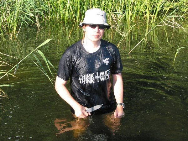 Jezioro Drwęckie. W drodze Kanałem Elbląskim na Szeląg Wielki zastał nas wieczór i musieliśmy urządzić sobie biwak na dziko przy brzegu za mostem po lewej stronie. Rano chcemy ruszać dalej, a tu... niespodzianka! Miecz nie schodzi do dołu. Żeglowanie bez miecza mija się z celem (chyba, że ktoś lubi pływać bokiem do przodu bez żadnej sterowności),więc trzeba sprawę zbadać. Maska na twarz i pod wodę. Okazało się, iż do skrzynki mieczowej weszły jakieś wodorosty, a wraz z nimi jakiś wredny kamyk, który zaklinował dokumentnie miecz. Nie było innego wyjścia, jak wziąć „coś” i wygrzebać cały ten syf pod wodą ze skrzynki mieczowej, a na koniec wydłubać jakoś kamień. Jedynym dostępnym „cosiem” był MK.VI, więc poszedłem z nim pod wodę i po kilku zanurzeniach wydłubałem wszystko moim nożem. Może brzmi do dość spokojnie, ale każdy, kto miał tego typu problem wie, jaka to jest robota. Praca nożem w charakterze łomu pod wodą pod dnem jachtu to chyba ostatnia rzecz, na którą miałem ochotę. Ale czasem nie ma wyjścia. Oczywiście MK.VI wyszedł z tej pracy zwycięsko, i ani muł i piach zmieszany z wodorostami ani żwirek nie zaszkodziły powłoce noża w istotny sposób. Starałem się dłubać grzbietową, tępą stroną noża, ale mimo to krawędź kilka razy przejechała po żwirku i laminacie – bez uszczerbku. Nóż trzymał się dzięki teksturze rękojeści zadziwiająco pewnie w dłoni, a przy takiej robocie pełna kontrola to sprawa podstawowa. W sumie dopiero po zakończeniu pracy dotarło do mnie, iż to, co robiłem nie było w sumie najbezpieczniejsze i nie trudno było o poważny wypadek. Ale skończyło się szczęśliwie. Płyniemy dalej!