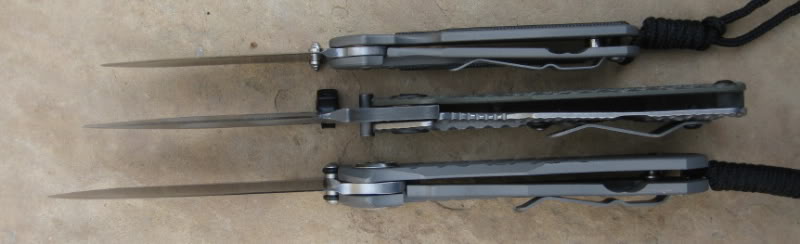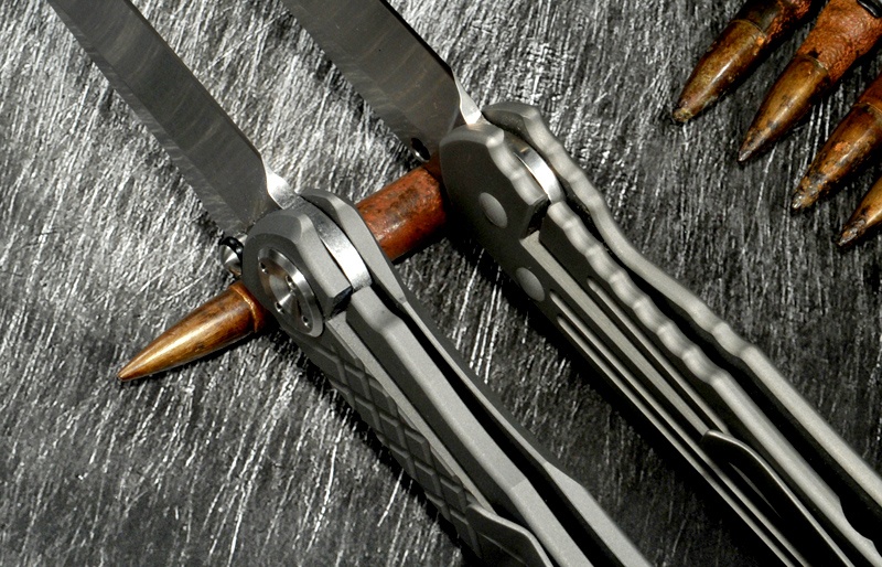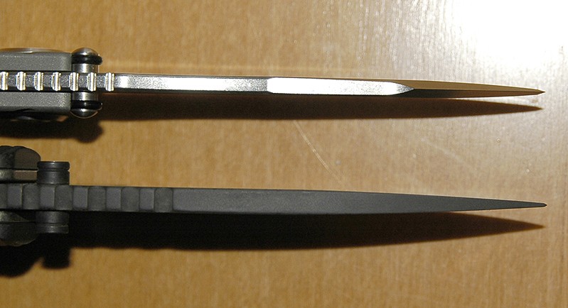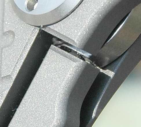 Na czym to polega? Ano jak wcześniej pisałem podkładki mają w sobie serię otworów. Ponieważ wszystko jest doskonale spasowane to między ostrze a podkładki może się dostać jedynie jakiś "pył" o średnicy powiedzmy 5% grubości podkładki. Ale i takie mikro-ziarno piasku w normalnym układzie BĘDZIE jednak lekko zgrzytać i piłować metal. Tutaj potrwa to do momentu, aż ziarno nie zostanie "wychwycone" przez dziurę w podkładce, więc najdalej przez około 1/10 obrotu!! Wszelki mikro-brud wchodzi w owe otwory i już tam zostaje nie przeszkadzając w płynnej pracy noża. A wszelkie większe drobiny po prostu nie wnikną między mosiążną podkładkę a ostrze. W przypadku podkładek teflonowych niestety różnie to bywa, bo teflon jest miękki i po prostu poddaje się takim ziarnom piasku, zazwyczaj zostając na miejscu już na zawsze. A tu genialnie zaprojektowane podkładki i konstrukcja osi zapewniają gładkość. Podobnie blokada - między kulkę a tył ostrza nie wejdzie piach, gdyż nie ma tam dwóch płaszczyzn, między którymi może się zakleszczyć - proste i genialne. I działa!. |