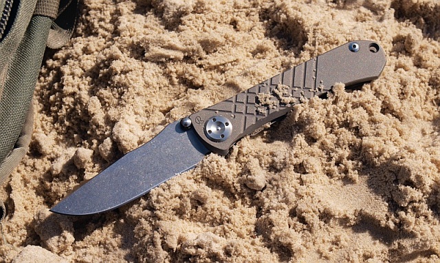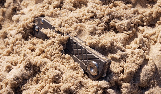 Umnumzaan - mały test "pustynny" Latem tego roku (2009) zostałem poproszony przez znajomego o nazwijmy to "piaskowy test" Umnumzaana... cóż, czemu nie? Zagrzebałem więc swojego "szefa" w piachu na plaży, po czym wyciągnąłem i sprawdziłem otweranie - gładko jak zawsze! Potem otworzyłem go kilka razy W PIACHU! I znów nóż chodzi bezproblemowo! Po prostu design wymusza pełną odporność na takie traktowanie. Poniżej fotki, a potem dwa słowa wyjaśnienia.