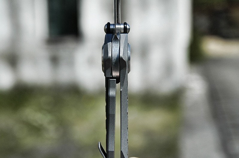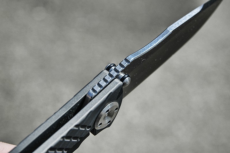 Słowo o mechanice - chodzi bajecznie. Dzięki tłumiącym dźwięk o-ringom na kołkach ten nóż po prostu nie klika przy otwieraniu, co BARDZO docenia... moja żona ;) A na poważnie, to po prostu cykl otwieranie/zamykanie jest w zasadzie bezgłośny - duża zaleta w składanym nożu taktycznym! Wspomniane o-ringi nie biorą oczywiście udziału w blokowaniu klingi, a jedynie wytłumiają uderzenie kołków o tytanową rękojeść, i w momencie blokowania "gumki" ustępują, zaś kołki opierają się bezpośrednio "tytan o tytan". Klinga chodzi bardzo płynnie. Szerokie podkładki posiadają na obwodzie "otwory zbierające", w których zatrzymują się ewentualne mikrozanieczyszczenia! A to w praktyce przekłada się gładkie działanie po wsze czasy. Dawno nie miałem tak miłego w działaniu noża. Oczywiście zero blade play... ale to u Reeve'a standard.