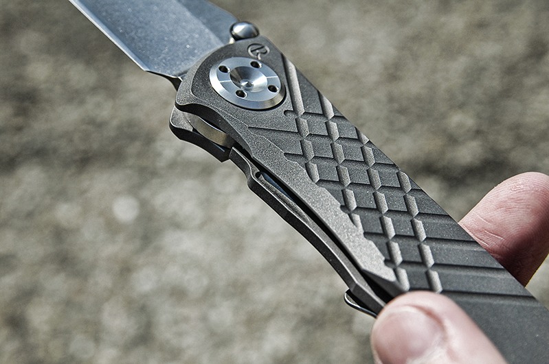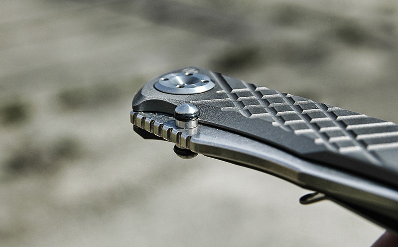 Nieco kontrowersji wzbudzały do niedawna gumowe o-ringi na kołkach Umnumzaana. Okazało się, że służą jedynie do wytłumiania otwarcia, więc ich ewentualnie zgubienie nie spowoduje bladeplaya. W przeciwieństwie do o-ringów stosowanych na niektórych Striderach AR te w produkcie CRK są osadzone niżej i w głębszych wyfrezowaniach. Nie są niczym przyklejone ale jak na razie pomimo wielu otwarć ani razu nie zmieniły swojej pozycji. Gumki w Striderach były osadzone praktycznie na samym szczycie kołka w malutkim i niezbyt głębokim wyfrezowaniu i to było pewnie powodem ich nagminnego spadania. Nie sądzę, aby ten problem występował w Umnumzaanie. Z tego, co wiem CRK bez problemu wysyła do Polski śrubki do Sebenzy [dop. prowadzącego serwis: są dostępne zazwyczaj od ręki], więc w razie zużycia o-ringów powinni bez szemrania przysłać nowe. Blokadę Umnumzaana uważam za najciekawszy element całego projektu. Na końcu listka frame locka osadzona jest spora ceramiczna kulka. Po pierwsze jest to detent ball, który blokuje ostrze w pozycji zamkniętej, a po drugie to właśnie ta kulka blokuje ostrze w pozycji otwartej. W przeciwieństwie do tradycyjnego framelocka tutaj tytanowy listek w ogóle nie dotyka stali ostrza! Ostrze blokowane jest właśnie na tej kulce. Wbrew pozorom to rozwiązanie ma sens i uważam je za lepsze od tradycyjnego frame`a, choć na początku miałem swoje obawy. W końcu powierzchnia styku z ostrzem jest tutaj taka mała. Moje wątpliwości rozwiał malutki test – spinewhacking , czyli uderzanie górną krawędzią klingi w kierunku jej składania. Do zawodów przystąpił jeszcze MT SOCOM i Emerson CQC 7. Erni złożył się po niezbyt mocnym uderzeniu. Socom wytrzymał trochę więcej, ale blokada również w końcu puściła. Umnumzaan zaliczył ten test bez problemu. Blokada trzymała ostrze pewnie, a nóż nie doznał żadnych uszkodzeń. Wracając jednak do tematu, to ta kuleczka ma jeszcze kilka zalet w stosunku do tradycyjnego frame`a. CRK twierdzi, że ceramika będzie ścierała się dużo wolniej trąc o metal niż tytan, co skutkuje większą żywotnością całej blokady. Druga sprawa: tytan czasami lubi mocno "przykleić się" do blokowanego ostrza, zwłaszcza, gdy przykładamy większą siłę w kierunku składania. Odblokowanie takiego składaka wymaga wtedy użycia większej siły. Integral lock zastosowany w Umnumzaanie zawsze będzie odblokowywał się tak samo płynnie przy użyciu minimalnej siły. To akurat prawda - sprawdziłem :) To koniec zalet blokady, teraz czas na wady, a w zasadzie jedyną - mam na myśli listek frame`a, który nie dość, że ledwo wystaje z obrysu rękojeści, to na dodatek ma ostre krawędzie. Widać to dość dobrze na zdjęciach. Może mam delikatne dłonie, ale pierwsze próby zamykania Umnumzaana zdecydowanie nie należały do przyjemnych. Jest to wg mnie zdecydowanie wada tego projektu, choc na pocieszenie mogę dodać, że po kilku dniach klikania idzie się do tego przyzwyczaić i już mniej drażni. Po kilku tygodniach nauczyłem się otwierać nóż w troszkę inny sposób i niedogodności związane z blokadą zniknęły. Kratownica na rękojeści również drażni wiele osób. Owszem, troszkę poprawia chwyt, ale głównie w sytuacjach, gdy nóż trzymamy mocno w ręku i przykładamy do niego większą siłę. W normalnych zadaniach dnia codziennego nie odczuwamy pozytywnych skutków jej obecności.