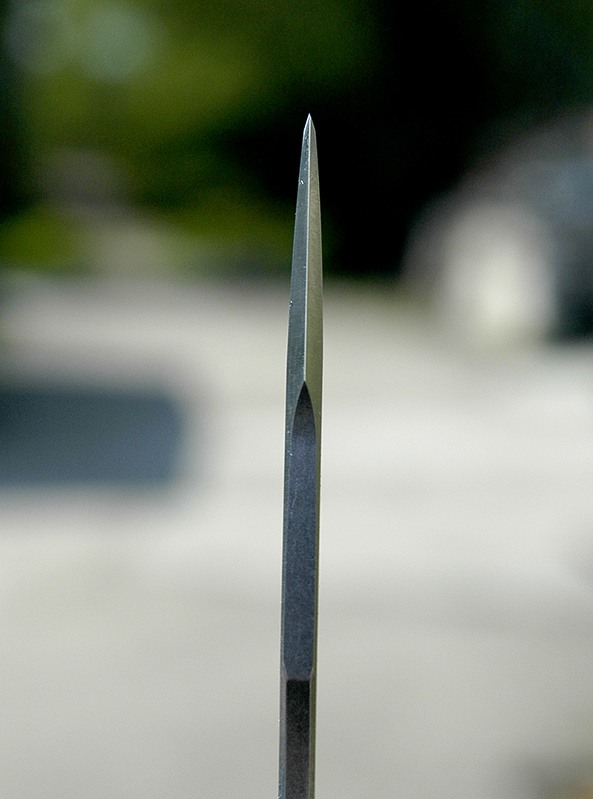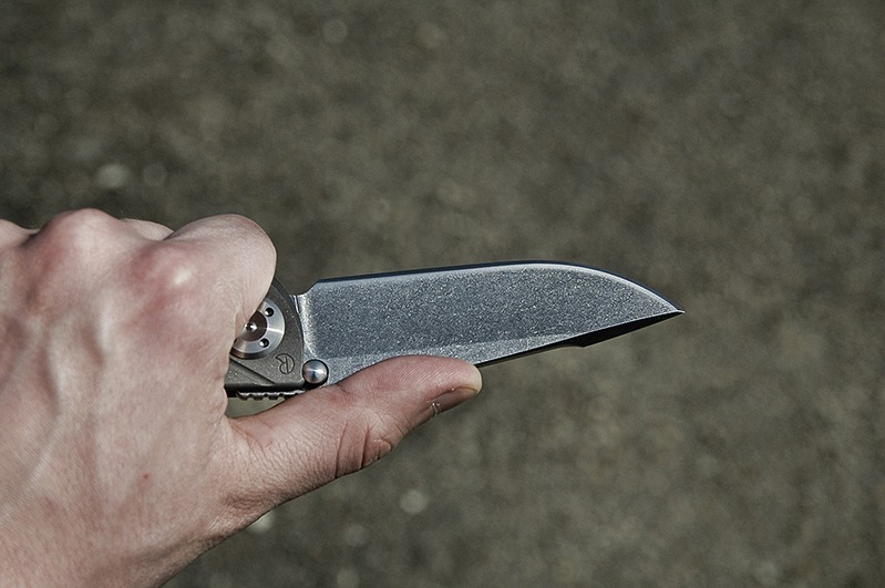 To, co zapada w pamieć przy pierwszym kontakcie z Umnumzaanem to dzwięk zapadającej blokady, a właściwie jego ... brak. Gdy otwierałem go po raz pierwszy byłem mocno zdziwiony, gdy nie usłyszałem charakterystycznego „klik”. Myślałem, że z nożem jest coś nie tak i ostrze nie zostało zablokowane w pozycji otwartej. Pierwszy odruch w takiej sytuacji to naturalnie wizualne sprawdzenie, czy blokada zapadła i najpewniej tak będzie wyglądał pierwszy kontakt każdej osoby z tym nożem. Otwiera się naprawdę bardzo cicho. Może nie zupełnie bezgłośnie, ale co najmniej kilka razy ciszej od na przykład SOCOMa. Jest to zasługą o-ringów umieszczonych na obu kołkach. Co do wykonania tutaj naprawdę nie ma się do czego przyczepić. Wszystko wykonane bardzo dobrze, zarówno szlify ostrza jak i sama rękojeść. Niedoróbek brak. Podobnie z mechaniką. Mój egzemplarz otwiera się naprawdę płynnie, choć jednak nie tak lekko, jak Sebenza, z którą miałem okazję go porównywać. Co ciekawsze detale rękojeści postarałem się uchwycić na zdjęciach, aby każdy mógł wyrobić sobie własne zdanie na ten temat. Teraz czas aby rozprawić się z wpomnianą wczesniej „listą grzechów” Umnumzaana. Glass Breaker w tym nozu jest moim zdaniem bardzo udanie połączony z całością projektu. Nie jest ostry, jego krawędzie są lekko zaokrąglone i naprawdę niemozliwym jest zrobienie sobie nim jakiejkolwiek przypadkowej krzywdy - to duży plus. Ale choc nie testowałem go jeszcze, to jestem prawie pewien, że nie będzie aż tak skuteczny, jak "ostre" glass breakery z MOD CQB Mark 1 albo niektórych MT. Coś za coś. Kolejny na liście jest swedge. Mnie od początku podobał się ten akcent na ostrzu. Cały nóż wygląda dzięki niemu bardziej agresywnie. Trochę poprawia zdolność penetracji, fajnie wygląda i to w zasadzie tyle. Jak widać na zdjęciu nie jest do końca ostry. Krawędź jest bardzo delikatnie sfazowana. Dla testu usiłowałem przeciąć nim jakieś kartki. Gdy używamy jedynie siły nacisku to zwyczajnie wszystko drze, jednak przy płynnym przeciągnięciu swedge`a przez kartkę mamy już rozcięcie. Postrzępione, ale zawsze. Jak na razie uważam ten element za względnie bezpieczny dla użytkownika. Mocne dociśnięcie kciuka do swedge`a nie zaowocowało przecięciem skóry. Zaś wklęsły łuk na grzbiecie klingi pomaga przy wykonywaniu precyzyjniejszych prac.W takiej pozycji mamy naprawdę świetne wyczucie noża a kciuk nie zsuwa się z klingi: (zdjęcie poniżej). Innym ciekawym elementem Umnumzaana jest oś główna. Bardzo potężna. Większa nawet od tej stosowanej w Striderach. Na dobrą sprawę to Umnumzaan jest prościej skonstruowany niż Sebenza, bo zamiast trzech śrub skręcających nóż tutaj mamy tylko dwie. To zapewne wyjaśnia cześciowo, dlaczego Reeve zdecydował się na taką oś główną. Poważną wadą jest jednak fakt, że w pudełku nie znajdziemy kluczyka do jej rozkręcenia [dop. prowadzącego serwis: klucze są jednak dostępne oddzielnie w zestawie serwisowym, w relatywnie niewielkiej cenie około $10]. Kolejną innowacją są perforowane podkładki. W dziurach ma zbierać się smar, który będzie stopniowo dozowany podczas otwierania ostrza, oraz mają osadzać się mikro-zabrudzenia. Wynikiem ma być płynniejsza praca i dużo rzadsze rozkręcanie folderka (zawsze to jakaś wymówka, żeby nie dawać kluczy od razu z nożem :P ). Pomysł niegłupi i sądząc po płynnosci, z jaką otwiera się Umnumzaan wydaje się jak najbardziej trafiony.