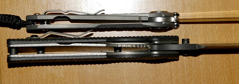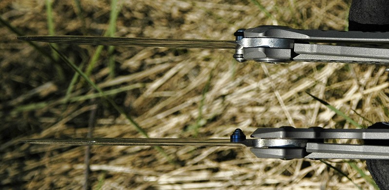 Omówienie ciekawostek i innowacji mamy za sobą, więc teraz przejdzmy do nieuchronnego porówania Umnumzaana z Sebenzą. Tej drugiej nie posiadam, ale miałem porównać na żywo egzemplarz kolego z moim nowym nabytkiem. Moje obserwacje są następujące: Umnumzaan jest dużo potężniej zbudowany od Sebenzy. Grubsze ostrze, grubsze tytanowe okładziny, to wszystko skutkuje tym, że w mojej dłoni leży lepiej niż Sebcia. Większe i wyraźniejsze wyfrezowania pod kciuk na klindze również uważam za duży plus.