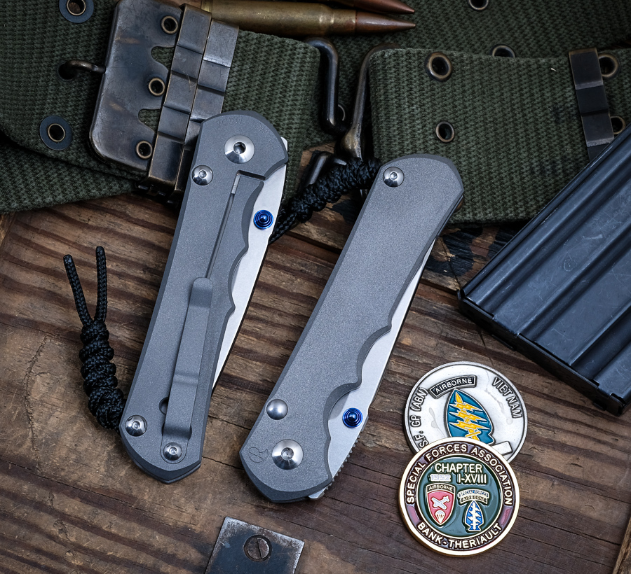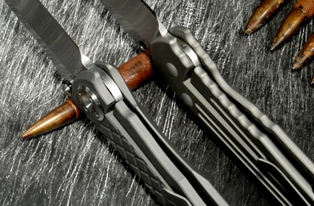 Uwagi: Tytanowa os z zamocowana linką do łatwego wyjmowania noża z kieszeni. Jest to mocowanie linki jak w nożu Umnumzaan - polecane do Sebenzy z uwagi na estetykę, wygodę użytkowania i bezpieczeństwo (nie ma fizycznie możliwości kontaktu linki z krawędzią tnącą).