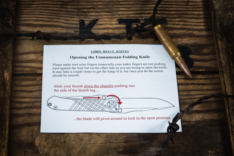 Uwagi: Umnumzaa to w języku Zulu "głowa rodziny, szef". I taki jest Umnumzaan! To nowy nóż składany Chrisa Reevea, wzmocniona "taktyczna" wersja Sebenzy. Grubsza i nieco dłuższa klinga, poteżniejsza rekojeść, żłobienia poprawiające chwyt oraz glass-breaker stanowiący przedłużenie zamkniętego ostrza. Obustronny kołek z gumkami wytłumiającymi dynamiczne rozkładanie noża. Do tego potężna gruba oś obejmująca silnie klingę u nasady. Klinga o dość agresywnym kształcie z wyprowadzonym krótkim i niemalże ostrym fałszywym ostrzem przy czubku w celu zwiększenia penetracji przy pchnięciu. Maszyna nie mająca sobie równych jesli chodzi o połączenie precyzji i mocy.