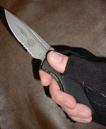 Ergonomia: nóż jest w sumie nieduży i mimo masywności budowy nie ciąży w kieszeni. Nosi się go wygodnie a szybkie wyjęcie umożliwia zamocowanie klipsa pod osią ostrza, a nie nad nią (tzw. High Ride, czyli wysokie noszenie). Jedyny punkt do którego muszę się przyczepić to wyprofilowanie rękojeści. MOD próbował wygodnie zmieścić wszystkie palce na krótkiej rękojeści, co zaowocowało tym, że mocny chwyt dużą dłonią nie należy do wygodnych. Chyba lepszym rozwiązaniem byłoby pozostawienie niedzielonej rękojeści, gładkiej na dole. Co prawda osoby o małych dłoniach nie będą tego tak mocno odczuwać, no ale komandos z wąską dłonią pianisty...? Zrzucam to na baaardzo szczupłą sylwetkę James'a Keating'a :) Generalnie nożem operuje się nieźle, jest dobrze wyważny (na osi ostrza) i nie tępi się zbyt szybko (doskonałe hartowanie). Dobycie, otwarcie, zamknięcie i schowanie noża wykonuje się odruchowo jedną ręką. Najlepiej pokaże to krótki film: |