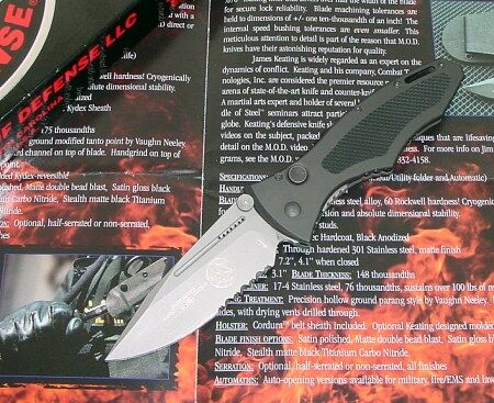 Projekt: Projekt Hornet'a jest wynikiem długoletnich doświadczeń James'a Keating'a na polu walki wręcz z wykorzystaniem broni białej. Założona przez niego szkoła ComTech - Combat Technologies i prowadzone seminaria The Riddle Of Steel przyniosły mu sławę oraz doświadczenie, którym dzieli się nadal ze swoimi uczniami (głównie z żołnierzami jednostek specjalnych wojska i policji). W umyśle James'a Keating'a powstał nóż taktyczny, który pozwoliłby obronić się przed uzbrojonym napastnikiem ale także wyważyć okno, rozpruć drzwi furgonetki czy w razie potrzeby przeciąć jednym ruchem pasy bezpieczeństwa. Przy tym nóż miałby zachować rozsądne rozmiary i niewielką masę. Kilka systemów noszenia noża oraz opcja automatycznego otwierania stworzyłyby wg Keating'a idealny nóż do samoobrony. Oczywiście nikt nie mówi, że Hornet nie wywiąże się z zadań codziennego użytkowania - wręcz przeciwnie, wytrzymała konstrukcja, doskonała jakość wykonania oraz sprawdzone materiały spokojnie poradzą sobie we wszelkich czynnościach. |