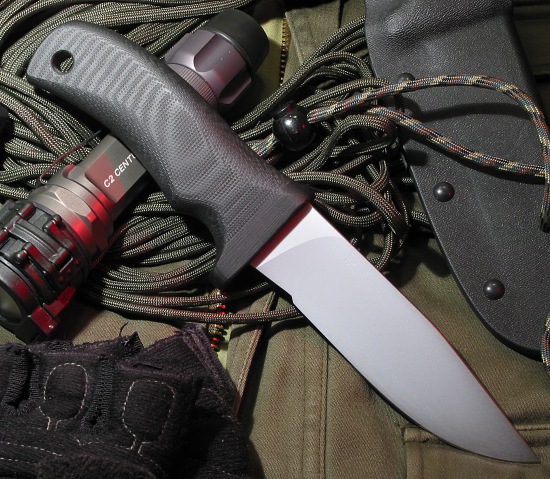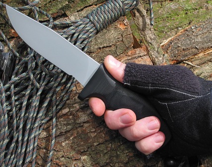 Wrażenia po wzięciu w dłoń. Już pierwsze zaciśnięcie dłoni na rękojeści P-ATAK’a daje jasno do zrozumienia z czym mamy tu do czynienia. Solidność wręcz bije od tego noża. Wykonana z kawałka stali węglowej Starrett 496-01, pięciocalowa klinga osadzona jest w rękojeści z niezniszczalnego w zasadzie kompozytu szklanego G10 o wyraźnej teksturze antypoślizgowej. Wyprofilowanie rękojeści to czysta poezja… nóż dopasowany jest do dłoni jak rękawiczka - lekcja z anatomii dłoni odrobiona na ocenę celującą. Ten nóż coś w sobie ma, i to da się wyczuć od razu. Sama klinga noża P-ATAK wywodzi się z noża Seal ATAK (klinga 7” długości) i jest po prostu skróconą, przeznaczoną do codziennego noszenia wersją, tego wspomnianego. Nóż ATAK był przez pewien czas etatowym nożem Navy Seals, jednak wysoka cena noży Mad Dog zmusiła US Navy do przyjęcia na wyposażenia innego, dużo tańszego noża. Nie zmieniło to jednak faktu, iż członkowie Seals i innych elitarnych oddziałów najczęściej po prostu sami nabywają dla siebie noże (i tu bardzo często pojawia się któryś z Mad Dog’ów), zostawiając etatowe wyposażenie w szafce w koszarach. Gdy od noża może zależeć życie, cena zwykle schodzi na drugi plan - liczą się przede wszystkim możliwości sprzetu. Niebezpieczne kształty. Co my tu mamy… wysoka klinga, pełny płaski szlif, prosty ‘clip’, spory, ładnie wyoblony brzuch i proste ricasso. Tak ukształtowana klinga sama zdaje się mówić „popatrz, jestem bardzo wszechstronnym nożem”. Klinga noża P-ATAK sprawdzi się podczas wyprawy do lasu, na polowaniu, na wypadzie survivalowym. Oczywiście rodowód wskazuje także na to, iż stal ta świetnie będzie się czuła także w ręku członka oddziałów specjalnych, komandosa, policjanta czy antyterrorysty. Kształt bowiem, mimo iż został zoptymalizowany pod kątem zastosowań użytkowych, gwarantuje też wytrzymałość. Brzuch sprzyja szybkiemu cięciu i skórowaniu, prosty odcinek klingi nadaje się doskonale do krojenia czy strugania. Czubek jest mocny, ale pozwala również na wykonywanie większości precyzyjniejszych prac. Prosty, krótki clip nie osłabia nadmiernie czubka a zapewnia przy tym dobrą, pewną penetrację. Zaś ricasso, z zaciśniętym nań palcem wskazującym, pomoże przy delikatnych, precyzyjnych pracach użytkowych prostym odcinkiem klingi. Tak więc, jak należy się spodziewać po nożu wysokiej klasy, forma klingi podąża za funkcją, a nóż ma bardzo szeroki zakres zastosowań. Czy coś jeszcze wyróżnia tą klingę? Wykonanie... i dochodzimy tu do bardzo ważnego momentu tego opisu… otóż noże Mad Dog nie są nożami produkowanymi fabrycznie, lecz są robione w całości ręcznie! Tak, P-ATAK podobnie jak ATAK, Panther, Voo-Doo Queen czy Saxon Sword są frezowane osobiście przez Kevina McClunga, znanego lepiej jako Mad Dog. Kevin wycina najpierw klingę ręcznie z kawałka stali O-1 a następnie szlifuje ją na poziomej, bocznej szlifierce pasowej, i uzyskuje płaski szlif pracując na okrągłym kole równolegle do jego średnicy (!). To niezwykle trudna technika, ale gwarantuje wykonanie doskonałego ostrza, z których właśnie Kevin słynie. Po naniesieniu znaku „Mad Dog” klinga jest hartowana (dyferencjalnie, a jakże) i poddawana obróbce termicznej gwarantującej potężną wytrzymałość i świetne trzymanie ostrza. Ponieważ O-1 jest stalą węglową (czyli rdzewną), klingi są na koniec powlekane antykorozyjną, wytrzymałą i niezwykle trwałą powłoką HardChrome. Tak więc Mad Dog to nóż klasy „hand made” - nie ma w nim nic z seryjnie produkowanych masowo noży. To idealnie wykonane, elitarne narzędzie dla najbardziej wymagających użytkowników, kilkakrotnie testowane podczas powstawania oraz przechodzące na koniec ostateczny test, bez przejścia którego żaden nóż nie opuści warsztatu Kevina Mad Doga. |