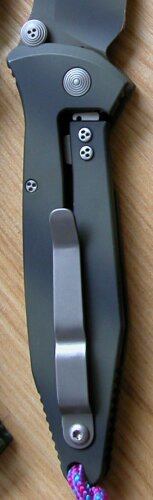 RĘKOJEŚĆ... Rękojeść Mini Socoma Elite frezowana na cyfrowych obrabiarkach CNC, wykonana jest z wytrzymałego a zarazem lekkiego duraluminium lotniczego z domieszką tytanu - 6061-T6. Rękojeść jest dosyć płaska co znacząco wpływa na komfort noszenia noża na codzień. Z jednej jej strony, przykręcony śrubą torx znajduje się bardzo solidny klips służący do zaczepienia Mini Socoma do kieszeni, paska, tudzież innych nadających się do noszenia noża części garderoby czy plecaka. Klips, tak jak każdy element noża jest niezwykle starannie wykonany i właśnie ta perfekcja oraz przykładanie dużej wagi do, wydawałoby się, mało istotnych detali noża jest wizytówką firmy Microtech. Osobiście nie spotkałem się jeszcze z Microtechem, który miałby choć jeden szczegół świadczący o niestarannym wykonianiu czy mało dokładnej kontroli jakości. Wydając niebagatelne nieraz sumy na produkty tej firmy możemy być pewni, że narzędzie to nie zawiedzie nas w potrzebie i będzie służyć przez długie lata.