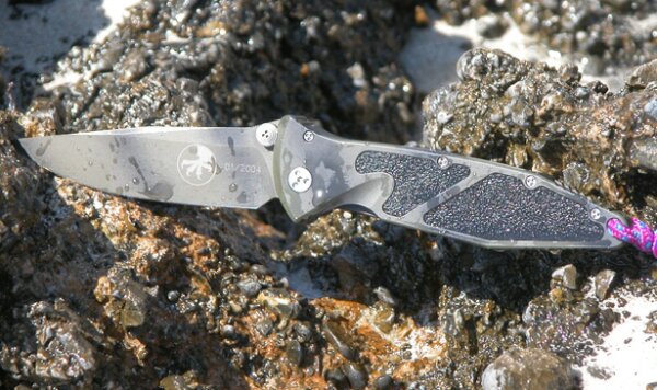 OSTRZE... Ostatnim, ale najważniejszym elementem Mini Socoma Elite jest oczywiście ostrze. Wykonane ze stali 154CM, wytworzonej przez koncern Crucible Powder Metalurgy. Jest to jedna z najlepszych stosowanych obecnie do produkcji noży stali. Charakteryzuje się dużą wytrzymałością na uderzenia i złamanie oraz długo trzymającą ostrze. Jedynym jej minusem jest znikoma (ale jednak) podatność na korozję, którą zresztą znacznie eliminuje powłoka pokrywająca ostrze, ale o tym za chwilę. W nożu o tych wymiarach i zastosowaniach spokojnie wystarczyłaby stal o niższych parametrach – choćby 440C czy VG-10, mimo to jednak firma Microtech nie schodzi poniżej pewnych, sprawdzonych standardów i nawet do niedużych modeli stosuje te same – wysokiej klasy materiały jak w większych „wołach roboczych” czy nożach taktycznych. Kształt klingi to klasyczny drop point podnoszący jej walory użytkowe. Grzbiet ostrza na długości ok 1 cm zaopatrzony jest w szereg drobnych „ząbków” tzw. thumb ramp, stanowiący bardzo przydatne podczas bardziej precyzyjnych prac oparcie dla kciuka. Do otwierania noża w wersji manualnej służy thumb stud czyli kołek z wyfrezowanymi nacięciami, dzięki którym otwieranie jest szybkie i lekkie. Dodatkowo płynność ruchu ostrza zawdzięczamy dodatkowemu, bardzo precyzyjnemu łożysku ślizgowemu wytoczonemu ze stali odpornej na ścieranie. Po otwarciu kołek opiera się o rękojeść, dodatkowo ją blokując. Nie zabiera przy tym jej cennej powierzchni użytkowej ostrza.