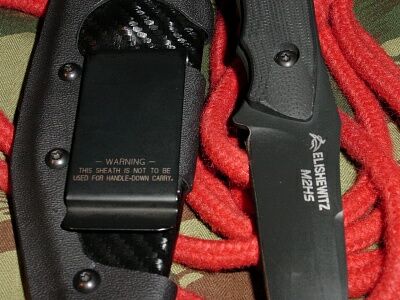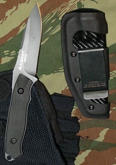 Rękojeść: Nóż posiada budowę typu "full tang", czyli rękojeść w formie nakładek z kompozytu G10 przymocowanych dwoma śrubami TORX bezpośrednio do kawałka stali z którego uformowane jest ostrze. Jest to obecnie najmocniejsza konstrukcja spotykana w nożach z klingą stałą. G10 jest chemicznie teksturowane na powierzchni tak, aby zapewnić maksymalne tarcie dla dłoni. Nimravus nie ma tendencji do wyślizgiwania się z mokrej dłoni, a także ubrudzonej smarem, olejem czy błotem. Dodatkową ochroną jest odpowiednie uformowanie chwytu dopasowujące go do kształtu dłoni oraz nieduża garda i ząbkowane podwyższenie do oparcia kciuka (thumb ramp). Okładziny profilowane są również na boki. Nóż można dodatkowo zabezpieczyć przed zgubieniem przeciągając przez przygotowany otwór rzemienną pętlę na dłoń. Pochwa: Pochwa wykonana jest z kydex'u z wkładem z włókna szklanego. Kydex'owa pochwa pozwala na szybkie dobycie noża i bezpieczne schowanie go do pochwy jedną ręką. Nie przeciera się, nie nasiąka, szybko odprowadza wodę. Wkładka z włókna szklanego pełni głównie funkcję zdobniczą i mogłaby być spokojnie zastąpiona kydex'em (tak było w pierwszej serii noży). Jednak Benchmade to firma znana z wyczulenia na punkcie estetyki wykonywanych noży. Kupując nóż Benchmade kupuje się zarówno funkcjonalność jak też pięknie zaprojektowane, pieszczące oko narzędzie. Można by rzec, że Benchmade pozbawia swoje noże "surowości" spotykanej np. w firmie Emerson, którą to surowość ja bardzo sobie cenię. Pochwę można nosić przypiętą do paska na dokręcanej szlufce z dodatkowym paskiem zabezpieczającym (system ten nie jest pokazany na zdjęciach) lub zapiętą pokazanym klipsem za pasek na zewnątrz lub wewnątrz spodni. Z uwagi na małe gabaryty noża i sztywną pochwę najwygodniej jest nosić ten nóż na klipsie wewnątrz spodni (na boku, lub na plecach). Rozstaw śrub na pochwie umożliwia także przypięcie uniwersalnego systemu noszenia Tec-Lock amerykańskiej firmy BladeTech. Poniżej mały film pokazujący nóż i pochwę. |