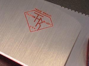 Prywatnie Trace Rinaldi to wspaniały, pogodny człowiek, wielki (także dosłownie) koneser cygar i najlepszych whisky, i przede wszystkim dusza towarzystwa. Ostatnio nawet, przy okazji robienia kilku indywidualnych projektów opartych na zapalniczkach Zippo, wykonałem dla niego jedyną w swoim rodzaju zapalniczkę, aby nigdy nie zapominał o swoich fanach w Polsce. Tytanowe Zippo poanodyzowałem w płomieniach na brunatno-błękinty kolor a następnie wygrawerowałem w niej jego logo oraz z dwóch stron nazwy moich dwóch ulubionych noży, które wyszły spod jego ręki: T.T.K.K. oraz Enigma. Nie muszę chyba dodawać, że „one-of-one custom Rinaldi Zippo” jest w użyciu przy każdym odpaleniu cygara przez Trace’a :) Ogólnie, po tych kilku latach mogę powiedzieć, iż Trace Rinaldi jest bezsprzecznie moim ulubionym knifemakerem, nie tylko ze względu na jego wspaniałe klingi, ale też (a może głównie) ze względu na jego filozofię „noża użytkowego”, pogodę ducha i otwartość z jaką się spotkałem. A wszystko to potwierdziło się w tym roku w czerwcu, gdy znów spotkałem Trace’a na Blade Show, gdy spotkaliśmy się w hotelowym barze, gdzie wręczyłem mu kilka wielkoformatowych zdjęć jego noży... zaś Trace, już przy szklaneczce whisky, wręczył mi niesamowity prezent, jedyny prototyp noża mini TUK (neck knife, na zdjęciu obok mam go na szyi) który zrobił specjalnie dla mnie! Wspaniałe podręczne narzędzie, tnące niczym laser wszystko z czym się zetknie. Wysoki płaski szlif schodzący do bardzo cienkiej krawędzi tnącej, stal S30V, rękojeść z włókna węglowego z czerwonymi przekładkami. Cudowna konstrukcja! Dzięki Trace! I do zobaczenia za rok.