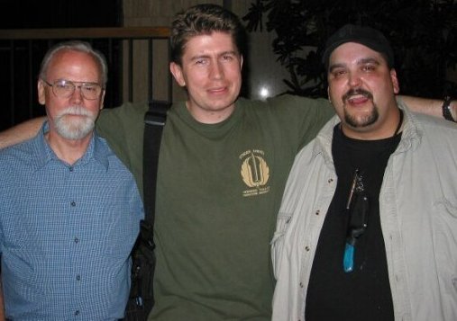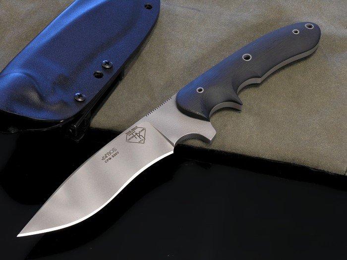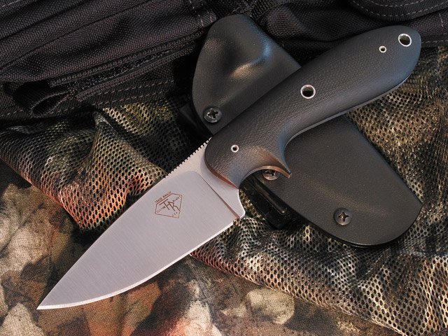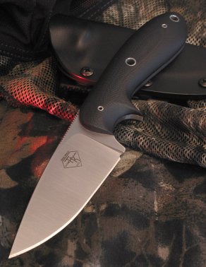 Ale wróćmy do samego Trace’a... tak jak pisałem rok 2003 był dla niego przełomowy i po raz pierwszy okazało się, iż ilość zamówień jaką dostaje przekracza jego możliwości w zakresie ich realizacji, a okres oczekiwania niebezpiecznie zbliżył się do 12 miesięcy. Na szczęście ostatnią rzeczą, jaką Trace kiedykolwiek by sobie pozwolił, byłoby przyspieszenie swojej pracy kosztem spadku jakości noży. Zdecydował się więc na inny, dość drastyczny acz konieczny krok i przestał przyjmować indywidualne zamówienia na swoje noże. Od tej pory przyjmuje zamówienia jedynie częściowo od osób pełniących aktywni służbę wojskową lub policyjną w USA, od kilku swoich zaprzyjaźnionych dealerów w Stanach Zjednoczonych oraz od garstki osób, z którymi łączą go osobiste przyjaźnie. Okazało się, iż mam zaszczyt należeć do tej ostatniej grupy i Trace przyjmuje regularne zamówienia również ode mnie. Trace stosuje na swoje noże w zasadzie wszystkie rodzaje stali: nierdzewną (jak BG42, S30V), stal damasceńską (tylko od najlepszych kowali damastu np. Devin Thomas, Rob Patton), a także jego ulubioną, choć stosowaną niezbyt często w jego projektach z uwagi na zachowanie pewnej szczególności, stal narzędziową A2. Hartowanie kling powierzył najlepszej osobie w tym fachu... oczywiście jest nią sam Paul Bos. Oprócz tego od czasu do czasu Trace wykonuje również na specjalne zamówienie noże z dość egzotycznego talonite’u. Jeśli chodzi o rękojeści to ulubionym materiałem Trace’a jest włókno węglowe, ale wykonuje też noże z rękojeściami z micarty, G10 a także drewna. Do mocowania okładzin stosuje albo stalowe nity tubowe, albo nity mozaikowe, które szczególnie w połączeniu z włóknem węglowym i czerwonymi przekładkami stanowią bardzo efektowne połączenie funkcjonalności i formy. Na zdjęciu obok od lewej: Paul Bos, autor oraz Trace Rinaldi.