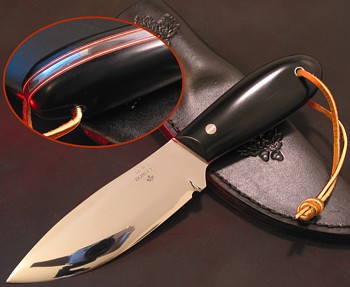 Uwagi: Noże wykonywane ręcznie przez George'a Tichbourne'a to po prostu sztuka użytkowa. Doskonałe opanowanie materiału, warsztatu oraz talent i doświadczenie czynią z noży George'a poszukiwane i skuteczne w działaniu narzędzia dla leśników, myśliwych, traperów, podróżników... czy wreszcie dla każdego, kto szuka dobrego noża z duszą. Moose Hunter to typowy przykład przybocznego noża trapera z północnej Kanady.