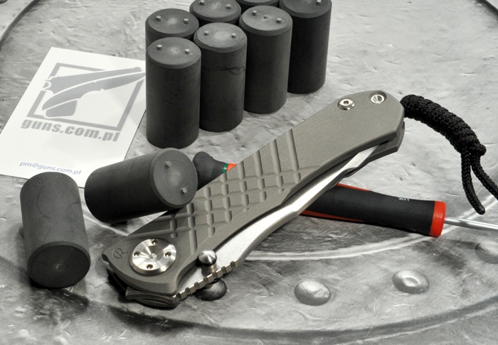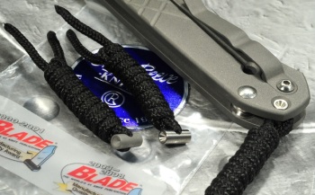 Uwagi: Tytanowa os z zamocowana linką do łatwego wyjmowania noża z kieszeni. Jest to mocowanie linki jak w nożu Umnumzaan - polecane do Sebenzy z uwagi na estetykę, wygodę użytkowania i bezpieczeństwo (nie ma fizycznie możliwości kontaktu linki z krawędzią tnącą).